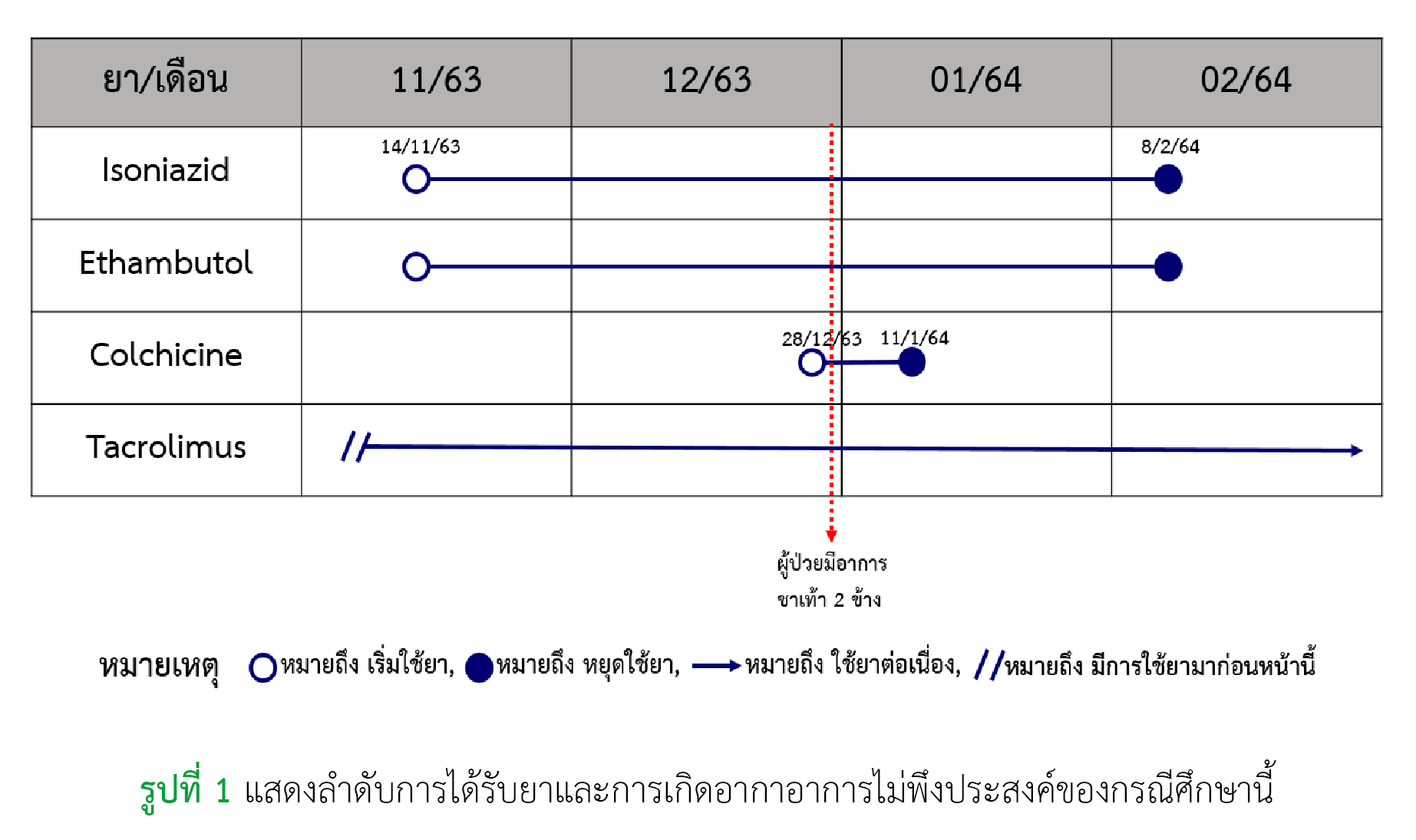 โคลชิซิน เป็นยาที่มีช่วงการรักษาแคบ ถูกเปลี่ยนสภาพโดยเอนไซม์ CYP3A4 จึงต้องระวังการเกิดอันตรกิริยาระหว่างยา และต้องปรับขนาดยาตามการทำงานของไต ผลข้างเคียงที่พบได้บ่อย คือ ท้องเสีย ปวดท้อง คลื่นไส้ อาเจียน และที่พบน้อยแต่รุนแรง ได้แก่ ภาวะกดไขกระดูก, myopathy และ peripheral neuropathy บทความนี้นำเสนอกรณีศึกษา ผู้ป่วยชายไทย อายุ 46 ปี ได้รับการปลูกถ่ายหัวใจ เป็นโรคเกาต์ และโรคไตเรื้อรัง ได้รับโคลชิซิน 1.2 มิลลิกรัม/วัน 2 วันต่อมามีอาการชาที่เท้าสองข้าง และถ่ายเหลว จึงลดขนาดยาลงเหลือ 0.6 มิลลิกรัม/วัน แต่ยังมีอาการชาเพิ่มมากขึ้นจนถึงสะโพก แพทย์ได้วินิจฉัย neuropathy จากโคลชิซิน หลังหยุดการใช้โคลชิซิน ผู้ป่วยมีอาการดีขึ้น สามารถวิเคราะห์ปัจจัยเสี่ยงที่สำคัญ ได้แก่โรคไตเรื้อรังและอันตรกิริยาระหว่าง tacrolimus และ โคลชิซิน ทำให้ผู้ป่วยมีระดับโคลชิซินในเลือดสูงเกินไปจนเกิดอาการไม่พึงประสงค์จากโคลชิซิน ดังนั้นเภสัชกรจึงควรระวังการใช้โคลชิซิน และเสนอปรับขนาดโคลชิซินให้เหมาะสมโดยเฉพาะในกลุ่มผู้ป่วยปลูกถ่ายอวัยวะซึ่งได้รับยากดภูมิคุ้มกัน และมีโรคไตเรื้อรังร่วมด้วย