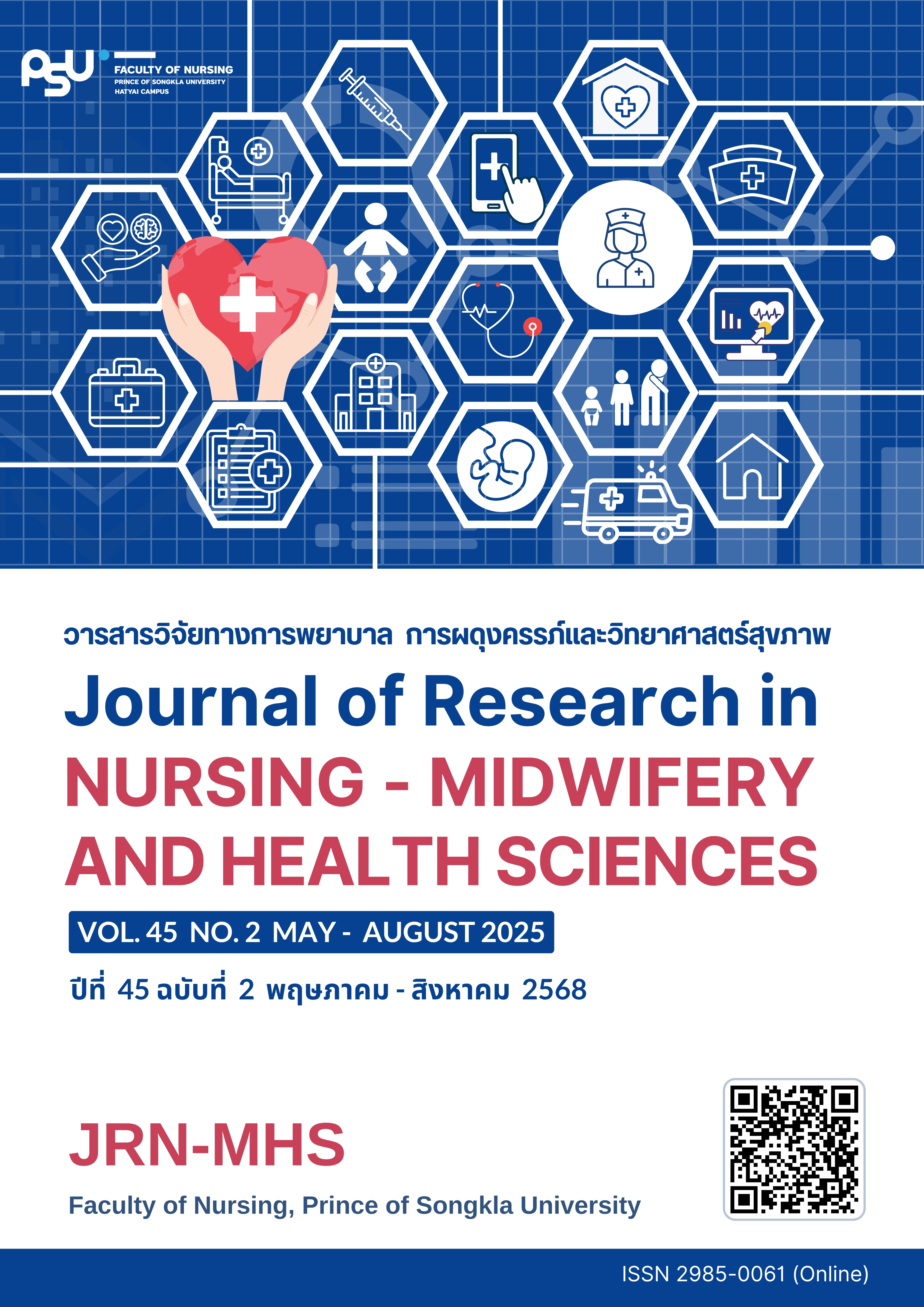 Journal of Research in Nursing-Midwifery and Health Sciences is a journal of the Faculty of Nursing, Prince of Songkla University, which was founded in 1981. Recently, it was certified by the Thai-Journal Citation Index Centre as TCI (Thai Citation Index) level 1 and ACI (ASEAN citation index). The editorial board of the Journal of Research in Nursing-Midwifery and Health Sciences is pleased to receive academic and research articles in Thai and English for publication and dissemination of academic results on nursing and public health of all health conditions and ages. The Journal is particularly focused on the continuity of care and usage of innovation in nursing, including nursing integrated with eastern wisdom that provides new knowledge for improving nursing and public health. We welcome contributions from students, professors, nurses, and academics both in Thailand and abroad. All manuscripts must be reviewed by experts both inside and outside the Faculty (internal and external reviewers), who are specialists in nursing, with experience and expertise in various fields before publishing. Peer review must be at least three persons per article (double-blind peer review). This journal is a four-month periodical, with three issues per year as follows: