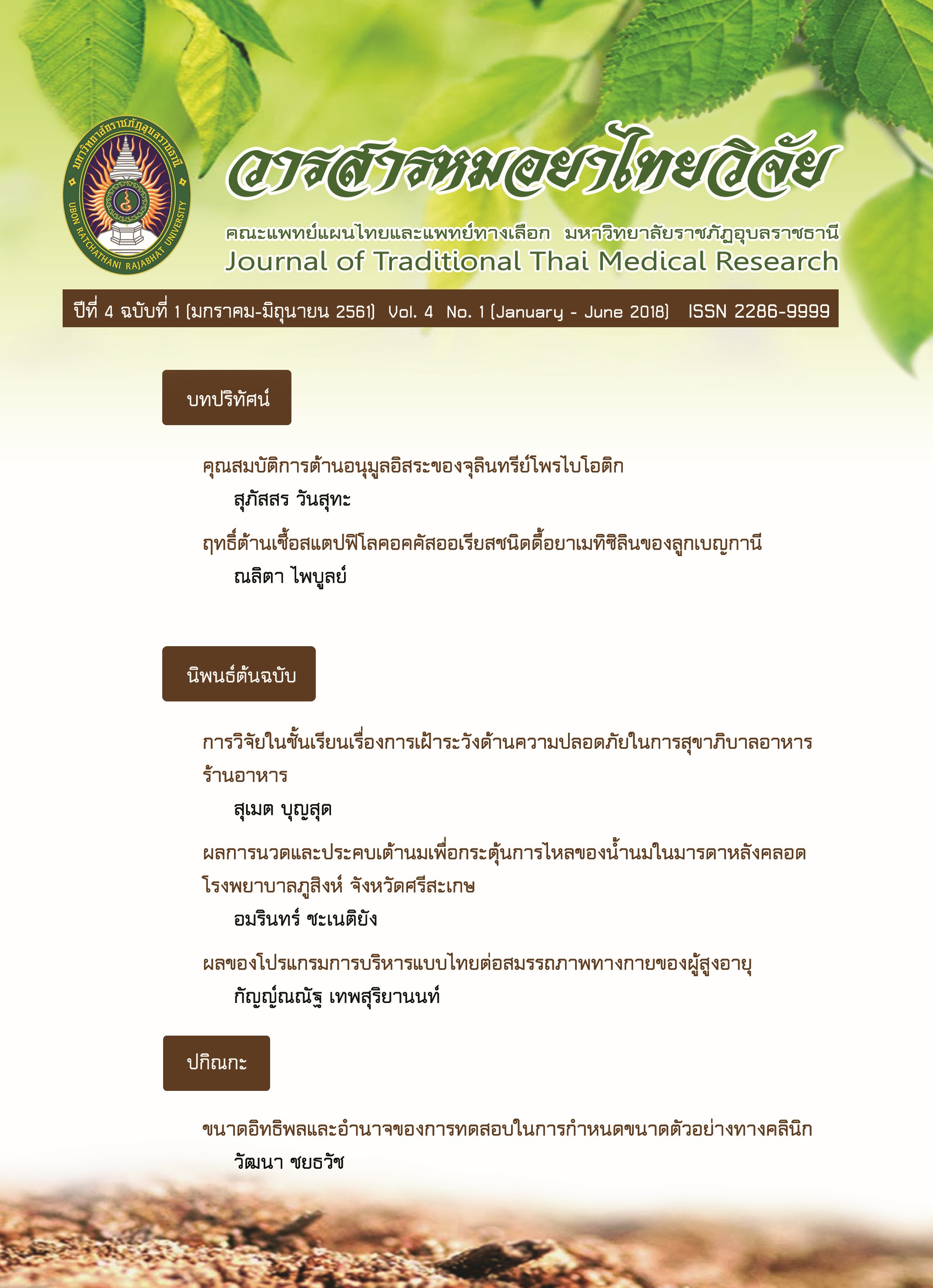 Vol. 4 No. 1 (2018): ปีที่ 4 ฉบับที่ 1 (มกราคม-มิถุนายน 2561) วารสารหมอยาไทยวิจัย